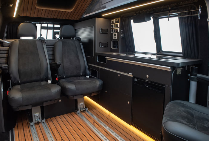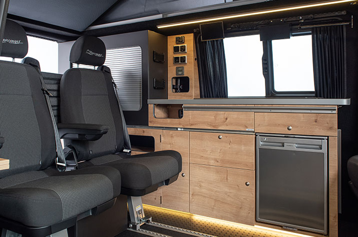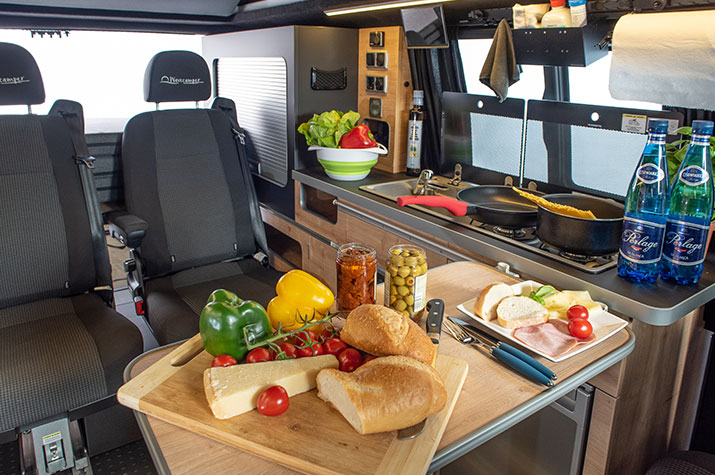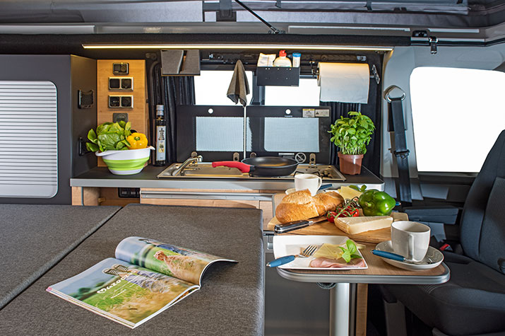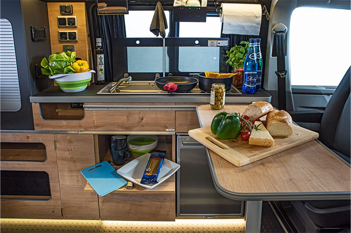 Der großzügige VW Campingbus verfügt über eine integrierte Küchenzeile – Spüle, zweiflammiger Herd und Kühlschrank mit Gefrierfach inklusive. Doch da endet der Komfort noch lange nicht: Durch die Abdeckungen über Spüle und Herd kann dieser Platz – zusätzlich zum ausklappbaren und flexibel verschiebbaren Tisch – als Arbeitsfläche genutzt werden. Die Besteckschublade und Küchenschränke sorgen für einen sicheren Transport der Küchenutensilien, zusätzliche Steckdosen ermöglichen den Einsatz der unterschiedlichsten Küchenhelfer – ebenso individuell und flexibel wie der Wavecamper selbst.