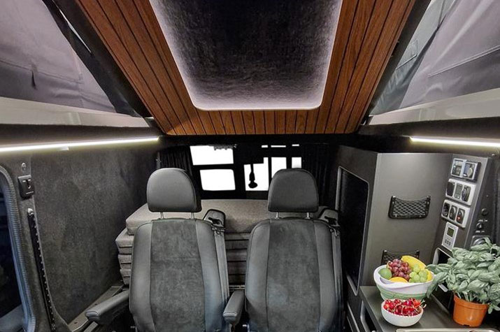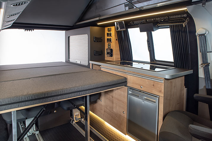 Sitze in der ersten Reihe in Fahrtrichtung. Unteres Bett ausgeklappt. Die Sitze der zweiten Reihe können hintereinander unter das Bett verstaut werden, so dass die Möglichkeit besteht, lange Gegenstände zu verstauen, während gleichzeitig 4 Personen schlafen können.