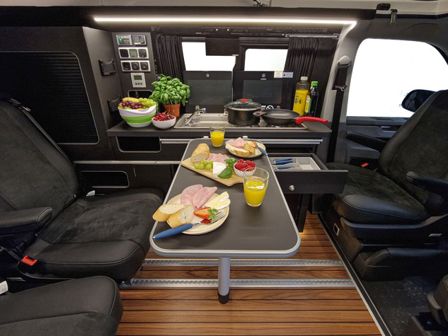 Gemütlich beisammen sitzen – zum Essen, spielen oder unterhalten: Der Innenraum des Campingvans bietet dazu die besten Voraussetzungen. Die flexiblen Vordersitze lassen sich ganz bequem zum Innneraum hin drehen, um in gemütlicher Runde zusammen zu sitzen. Ein schönes Abendessen zu viert oder ein Gesellschaftsspiel mit der ganzen Familie? Kein Problem durch den zusätzlichen, ausklappbaren Esstisch. Nur ein gemütliches Getränk miteinander genießen? Dazu den am Schienensystem flexibel führbaren Ausklapptisch nutzen. Einfach nur sitzen und lesen? USB-Leselampe einschalten und entspannen.