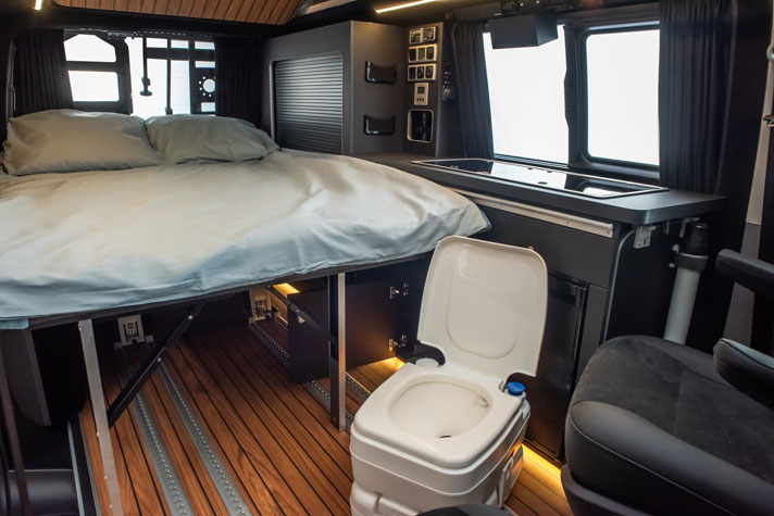 Zusätzlich zum gemütlichen, ausklappbaren Bett im Inneren des Campers bietet das Hubdach zwei weitere komfortable Schlafplätze mit einzigartiger Aussicht. Die bequemen Matratzen, das im Dach integrierte Moskitonetz sowie die Vorhänge in den Fenstern sorgen für einen erholsamen Schlaf. Das Besondere: Unter dem Bett im Inneren finden, sofern dieser Platz nicht als großzügiger Kofferraum genutzt wird, zwei zusammengeklappte Sitze Platz. Sämtliche Schränke sowie die in die Küchenzeile integrierte Chemietoilette sind auch bei ausgeklapptem Bett erreichbar und lassen sich bequem öffnen.